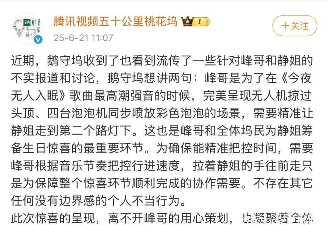 节目组这边也发了个声明,腾讯视频官方账号“鹅守坞”专门发布了阐发,说汪峰在宁静过诞辰这圭臬(等于唱《彻夜无东谈主入眠》热潮那会儿),得精准地把她带到指定的位置,面子无东谈主机流星和泡泡机的扮演,牵手肃肃互助责任的需要,等于为了过程能顺畅,没其他的意念念,也不存在什么越界。